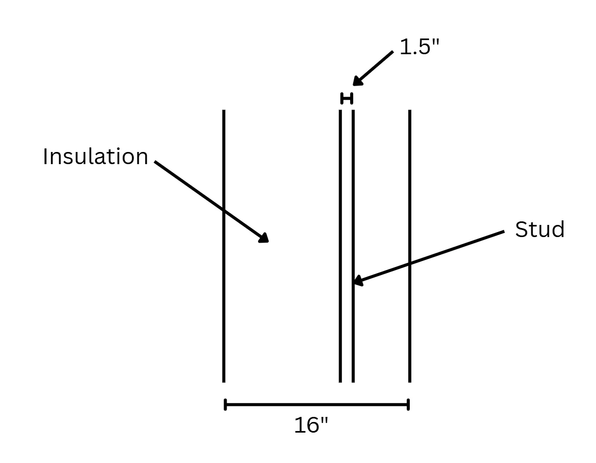 For example, suppose a wall assembly has an insulation cavity that is 3.5” thick with batt insulation and oak studs that are 1.5” thick, located every 16”. Since any 16” piece of wall length will include exactly one full stud, then we can take any sample of 16” for consideration.
